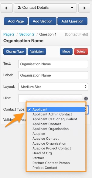 To edit these forms you will need to select the question in the canvas area of the form select each of the contact questions you wish to create contact records for and select which ‘contact type’ you want it. Ensure you save the form as you edit.