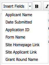 You can also Insert Fields, which are special placeholders that are replaced when the confirmation message is being sent with information specific to the user and application that is being submitted. The fields available are: