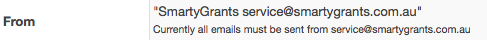 At present, all emails sent from SmartyGrants must come from the email address service@smartygrants.com.au (AU/NZ) or service@smartygrants.co.uk (UK/Europe). This is to avoid running afoul of anti-spam filters, and is the safest way to ensure that your message is actually delivered to the applicant.