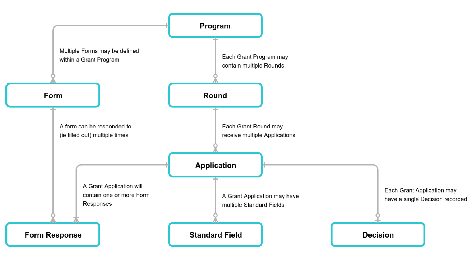 SmartyGrants’ data model groups grant Applications into Programs and Rounds. Forms, such as those that an applicant will complete when applying for a grant, belong to a Program and can be re-used in multiple Rounds. Each time a Form is completed, a Form Response is created. The below entity-relationship diagram describes the logical data model around Applications, and is a useful reference for understanding the Applications API.