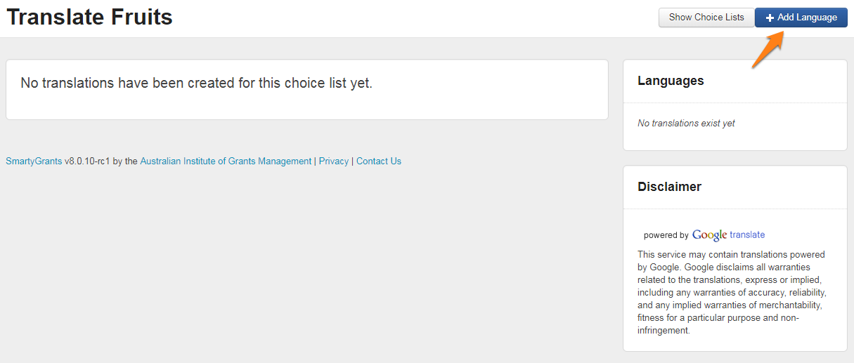 If you are interested in enabling translations for your SmartyGrants account, please contact the SmartyGrants Support Team. For related pricing costs please visit our Pricing page.