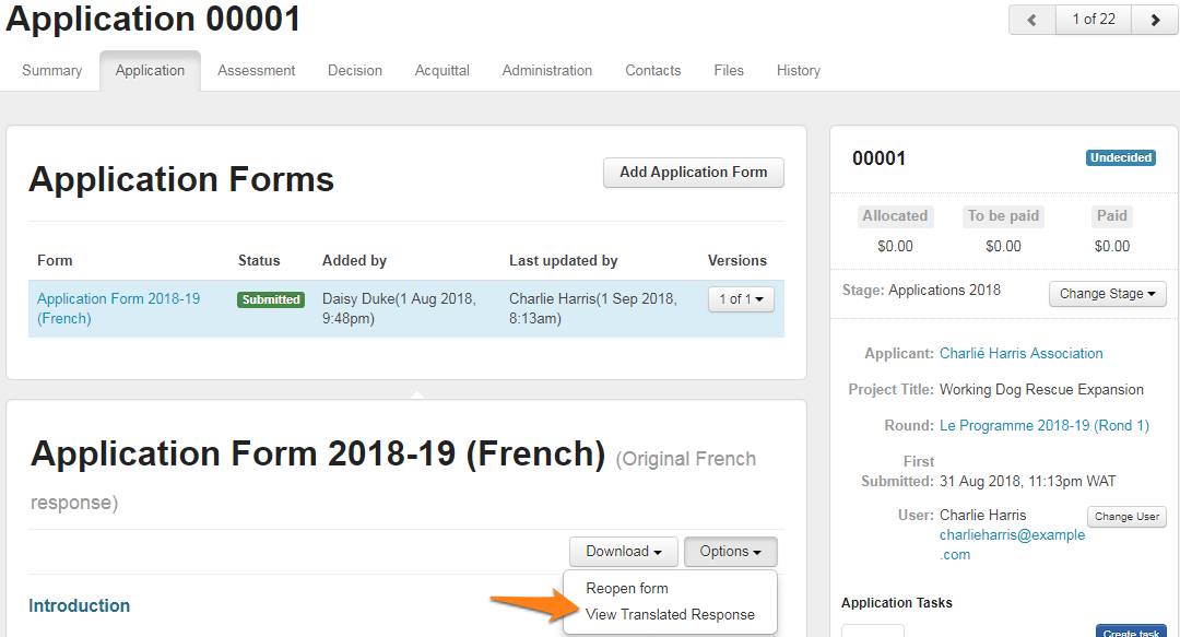 Utilise Google Translate to translate the contents of responses of standard fields into English. The English translations will then be stored in the Standard Field response on the summary tab for each grant application.