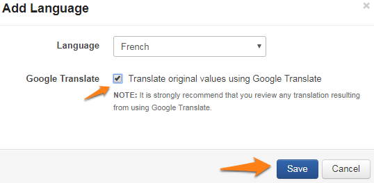 Select the tick box that will allow Google Translate to translate the existing choice from English to your translated language, and then select Save.