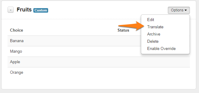 Find your choice list, click on Options and then Translate.