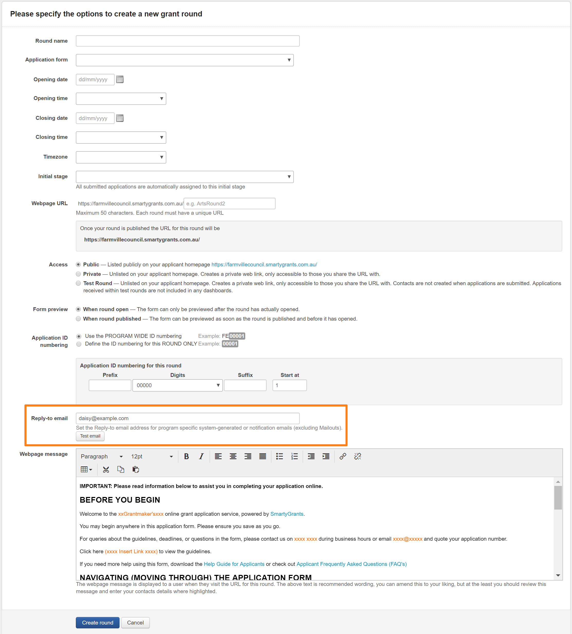 * Rounds are set to use the program reply-to email address by default. This means that if you do not set a reply-to email address at the round level, the program reply-to email address will be used. If you set a reply-to email address at the round level, then this will override the program reply-to email.