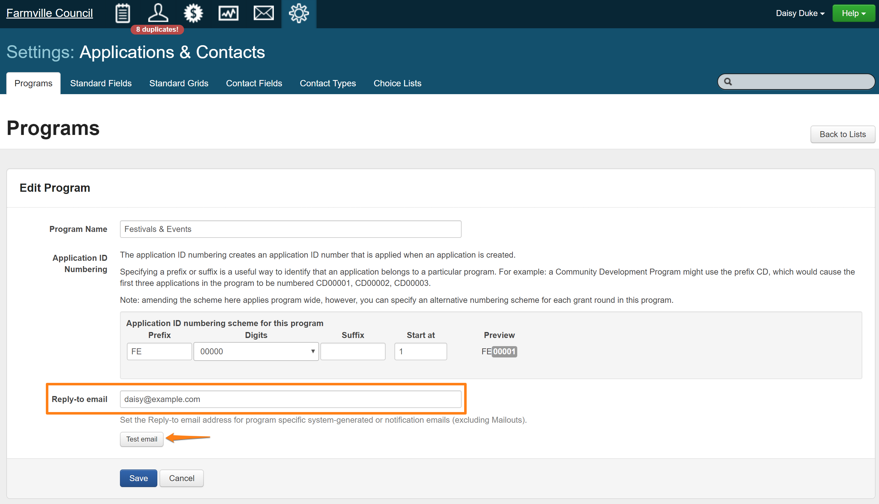 An administrator can change the “reply-to” email for individual programs through the Program Settings. By default, this will be set to the Account wide reply-to email address (set above).