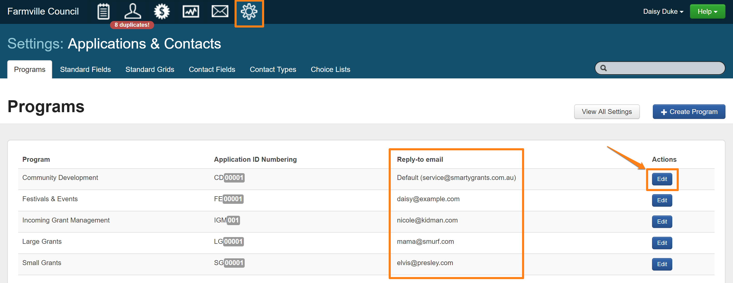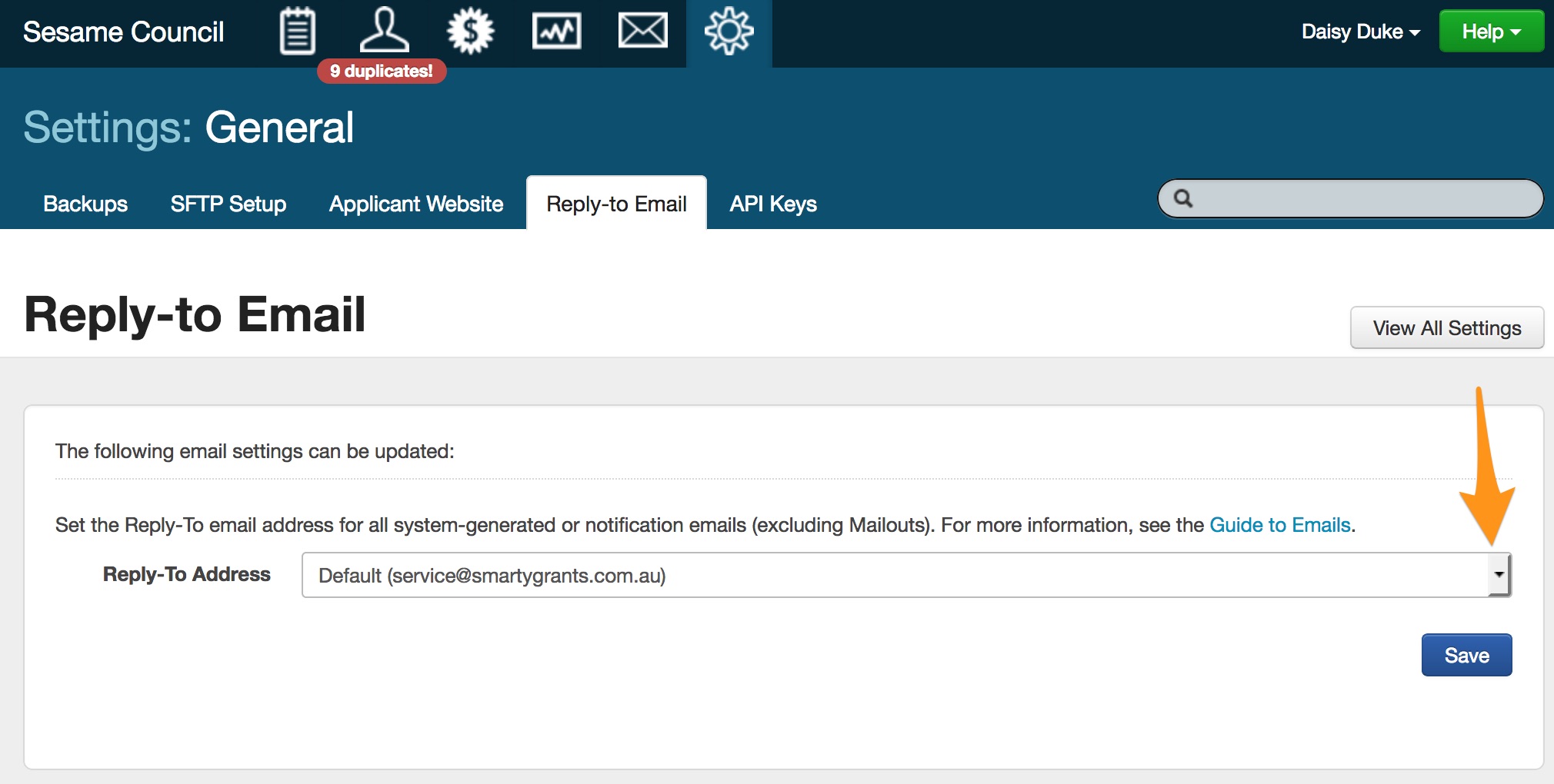By default, the "reply-to" address for all system-generated or notification e-mails is set to service@smartygrants.com.au (AU/NZ) or service@smartygrants.co.uk (UK/Europe).