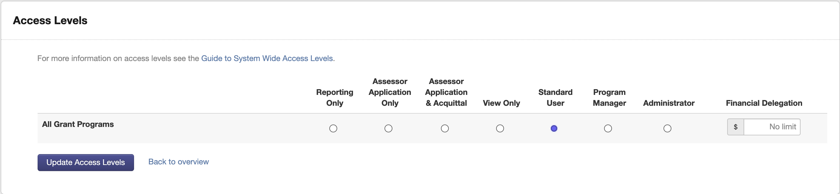 - Select the relevant choices for your user and click on 'Update Access Levels' button, you user set-up is now complete (for further details on access levels see User Types & Access Levels).