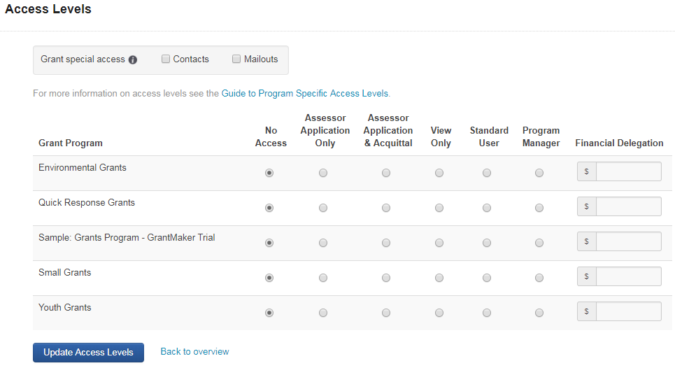 - You will then see some extra access options appear on screen, users are automatically assigned to 'No Access' until you assign a different access type.