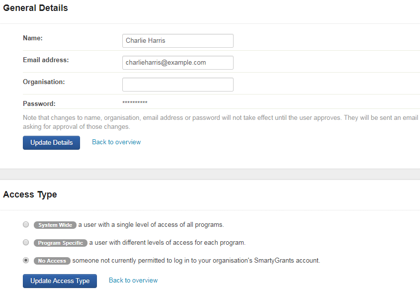 Select the access type you wish to assign your user and click on Update Access Type (see User Types & Access Levels for more information). - Dependent on what access type you choose another window will appear - window options are different for each access type. For example;