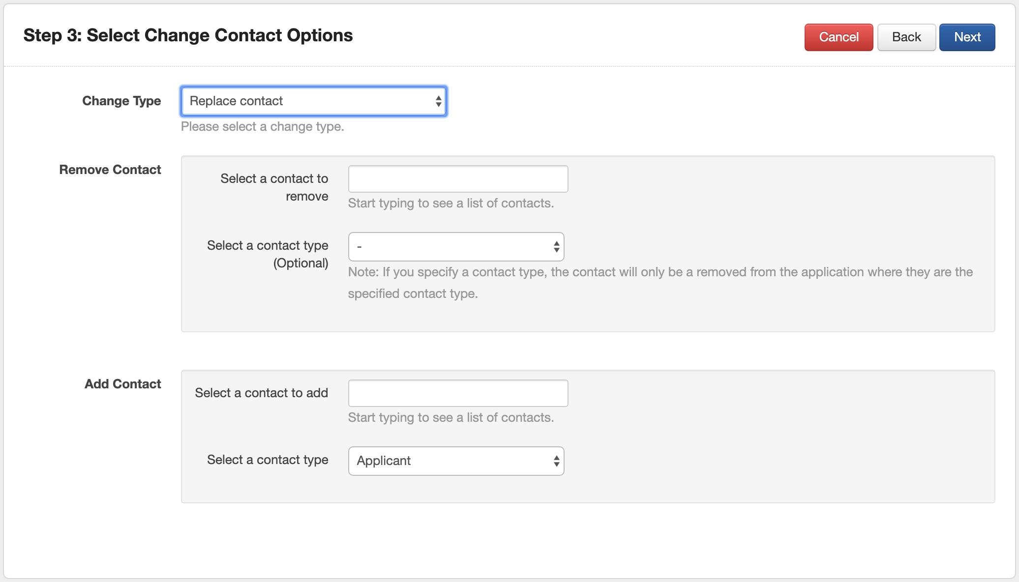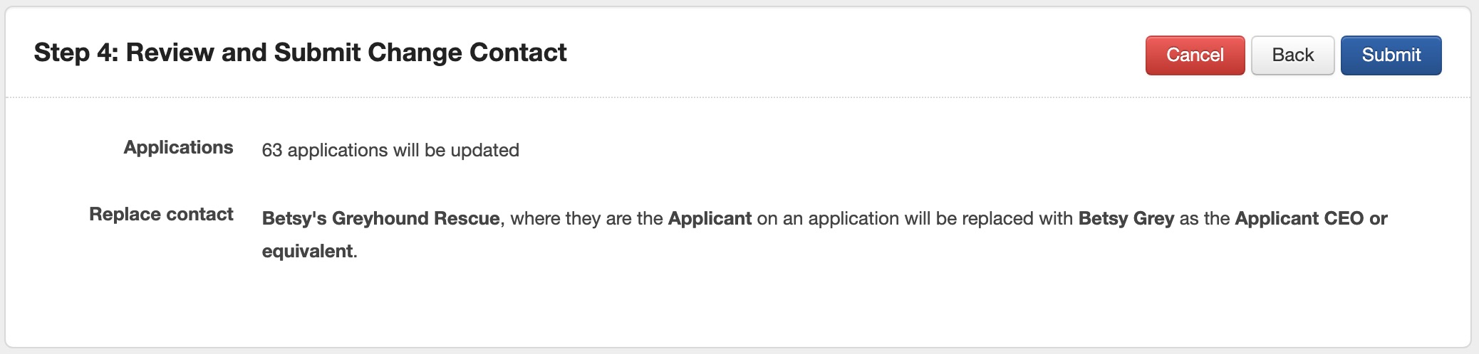 Change Contact: Add, remove or replace contacts from selected applications (grant involvement roles)