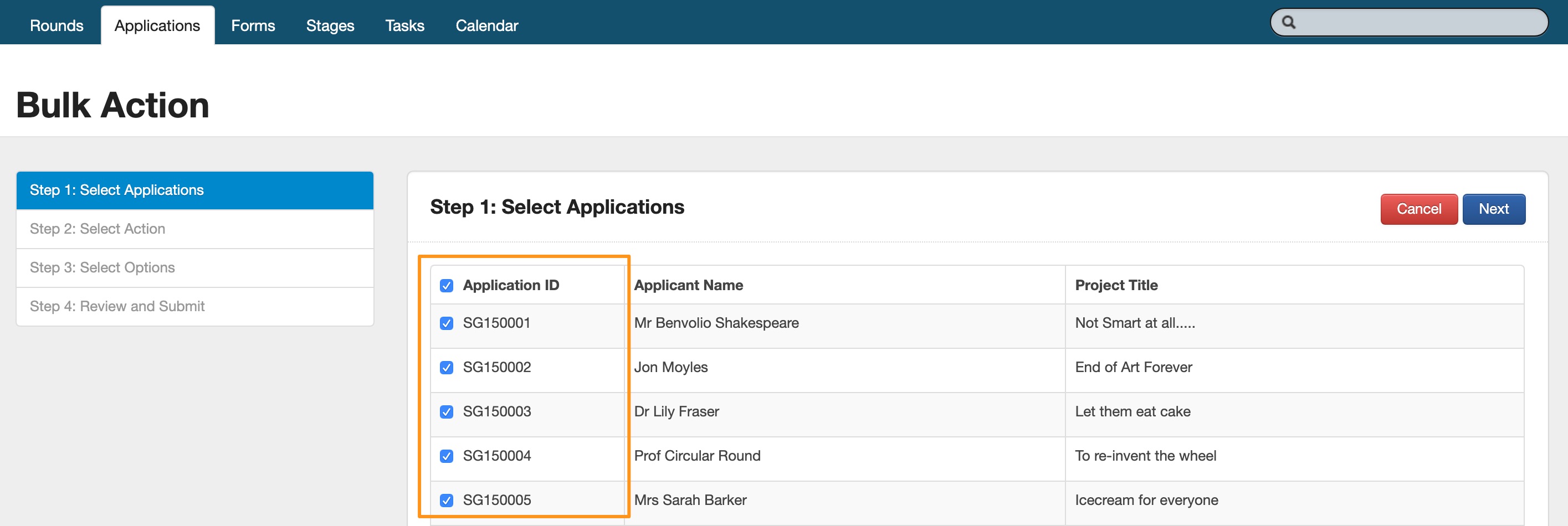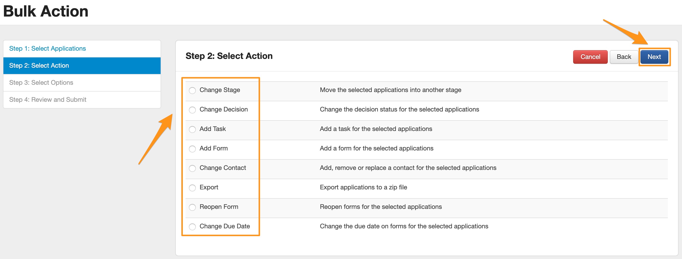 The Bulk Actions described on this page relate to the application filter screen and managing applications. For information on using Bulk Actions to manage tasks, see our tasks page.