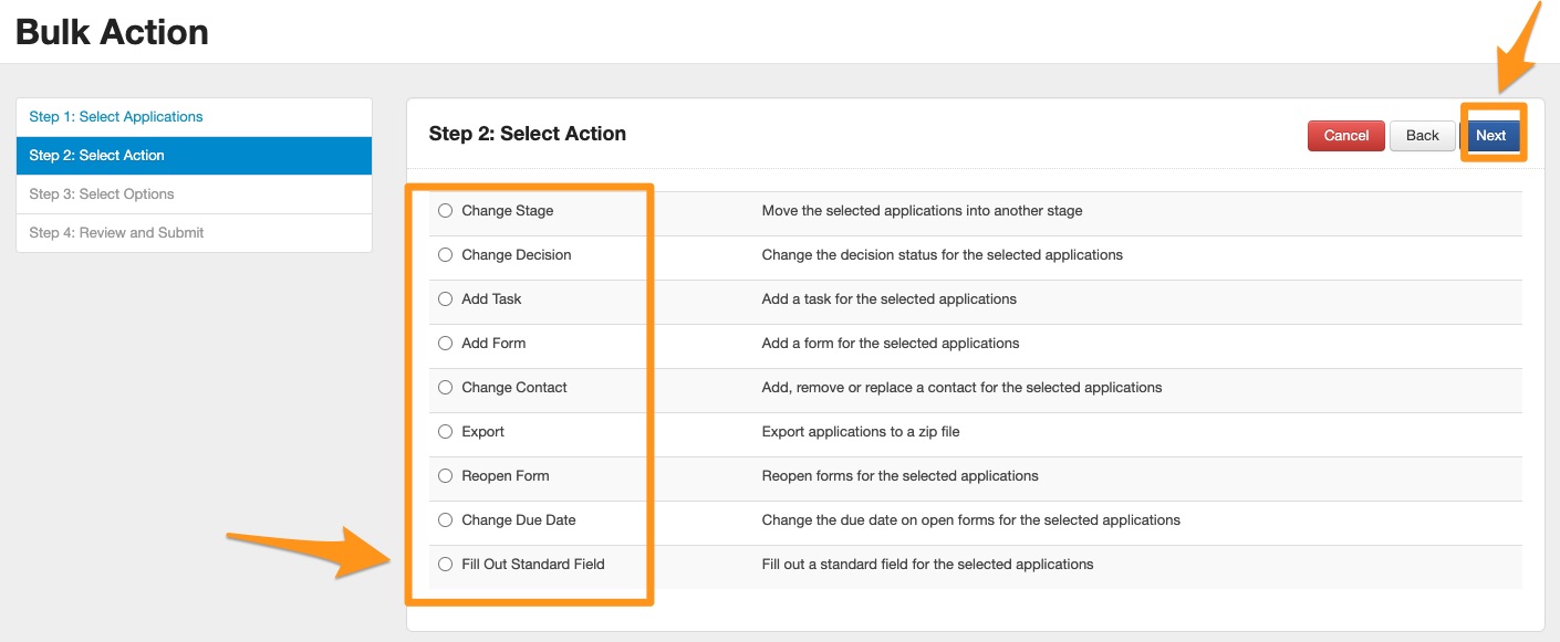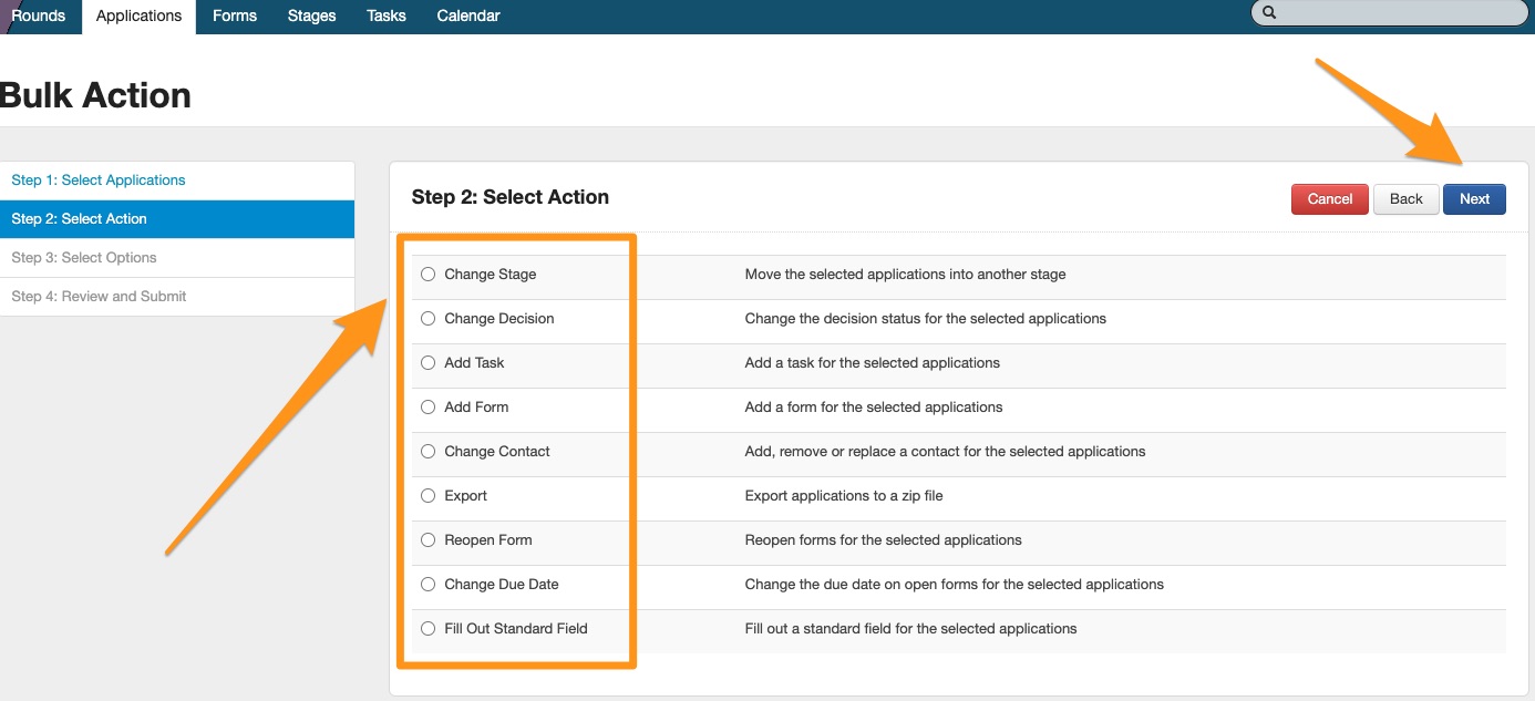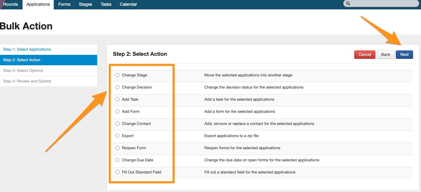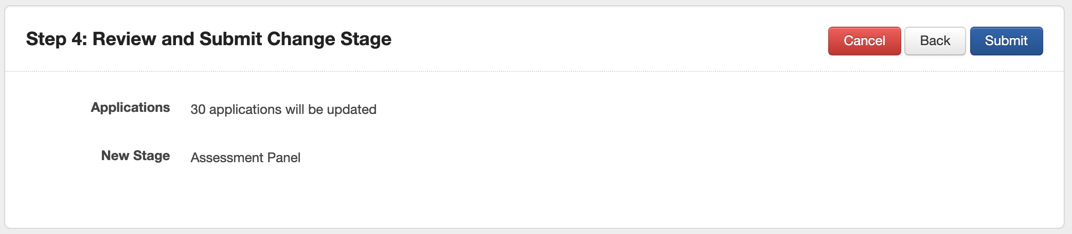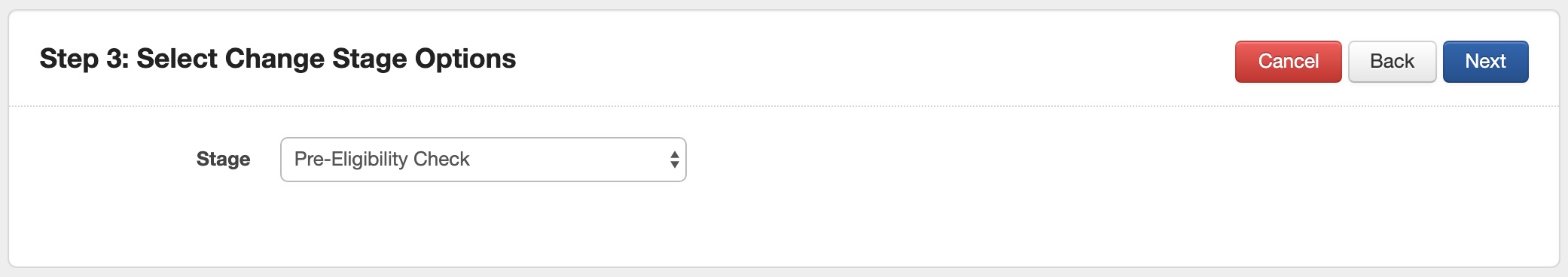 Select the 'Change Stage' option and then click the 'Next' button. *Note: You may only apply one bulk update operation to a group at one time.