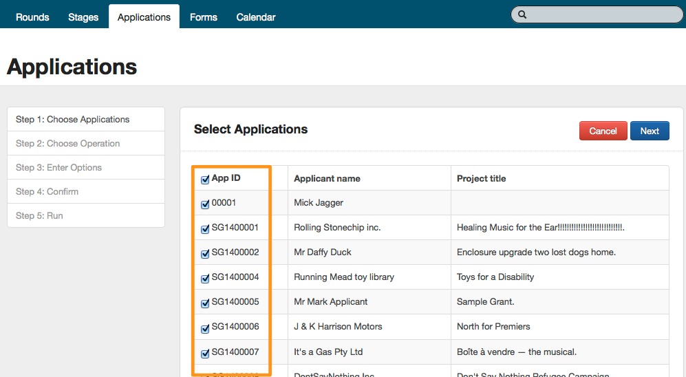The list of applications you had filtered will now appear on screen. If you wish to deselect any, this is your opportunity. To do so - click on the tick box next to any applications you wish to deselect. When you are happy with your selections click the Next button.