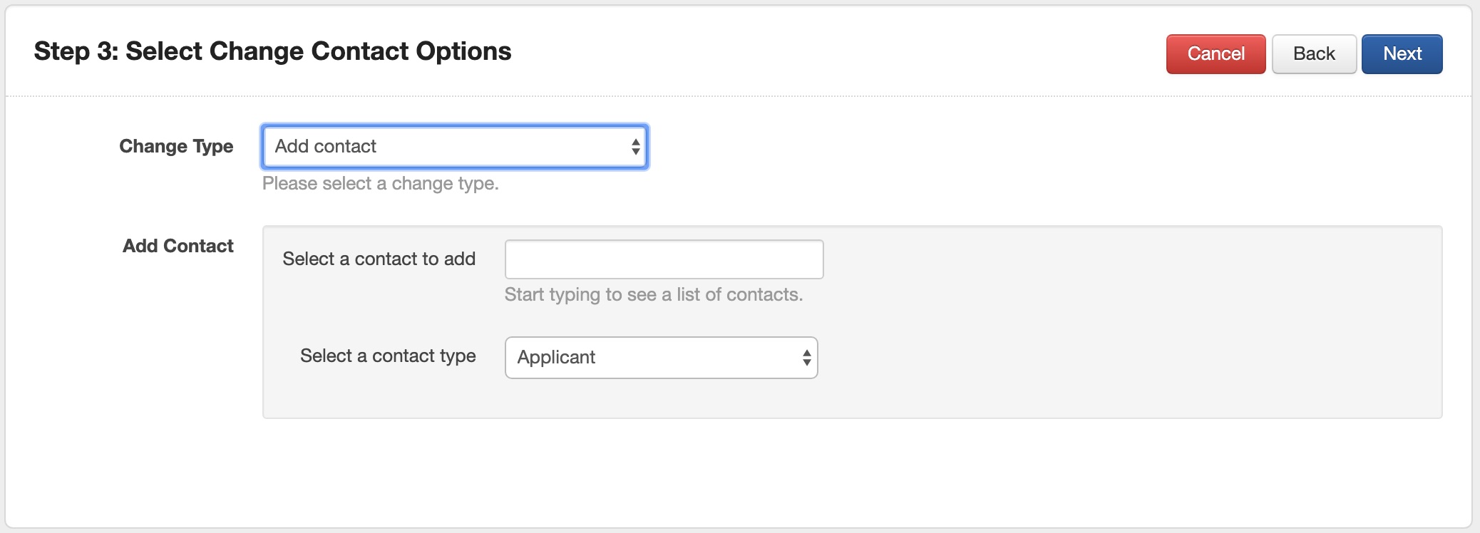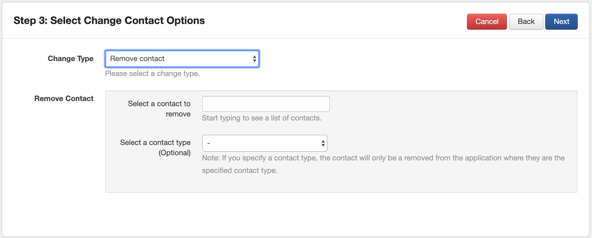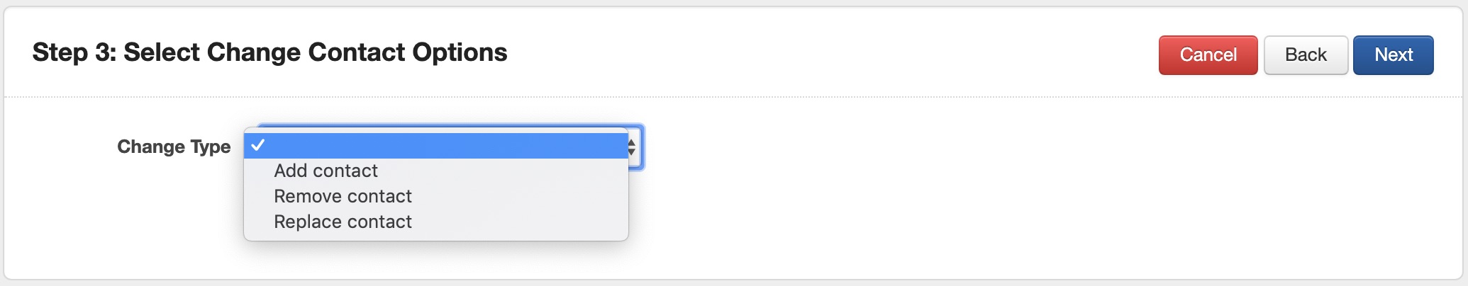 Select the type of change you wish to make, either add, remove or replace a contact. Then follow the relevant instructions on screen *note this change will be applied to all the selected applications, then click on the 'Next' button.