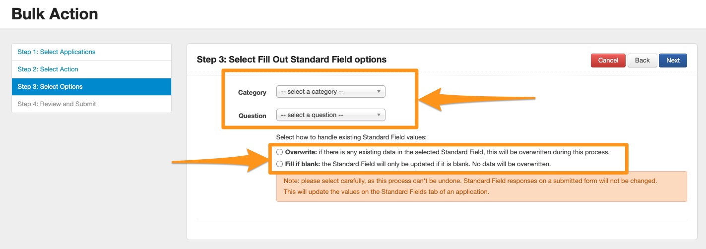 Once you have selected your application you may then select the bulk action Fill out standard fields