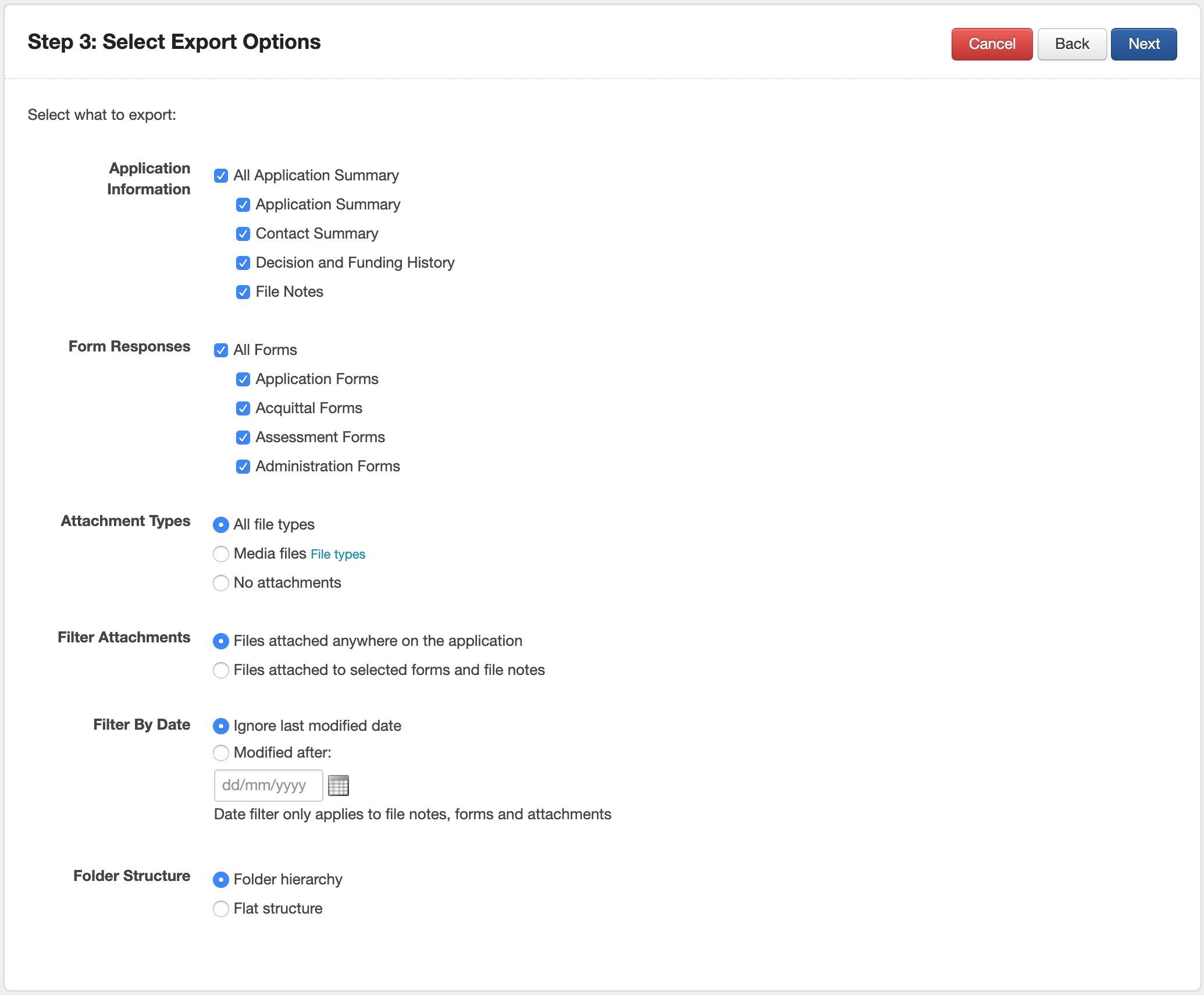 Last modified date - This only only affects form responses and file notes. If a specific date is selected, only items modified after the date specified will be included in the export. Using this option you can just export items that have changed since your last export and thereby avoid duplication in your system.