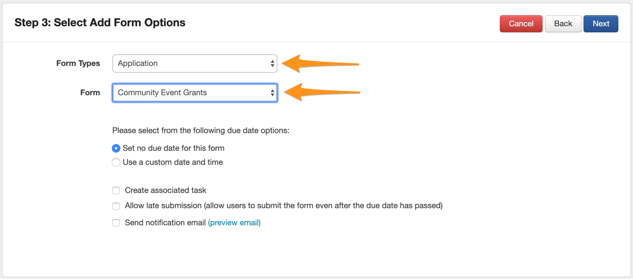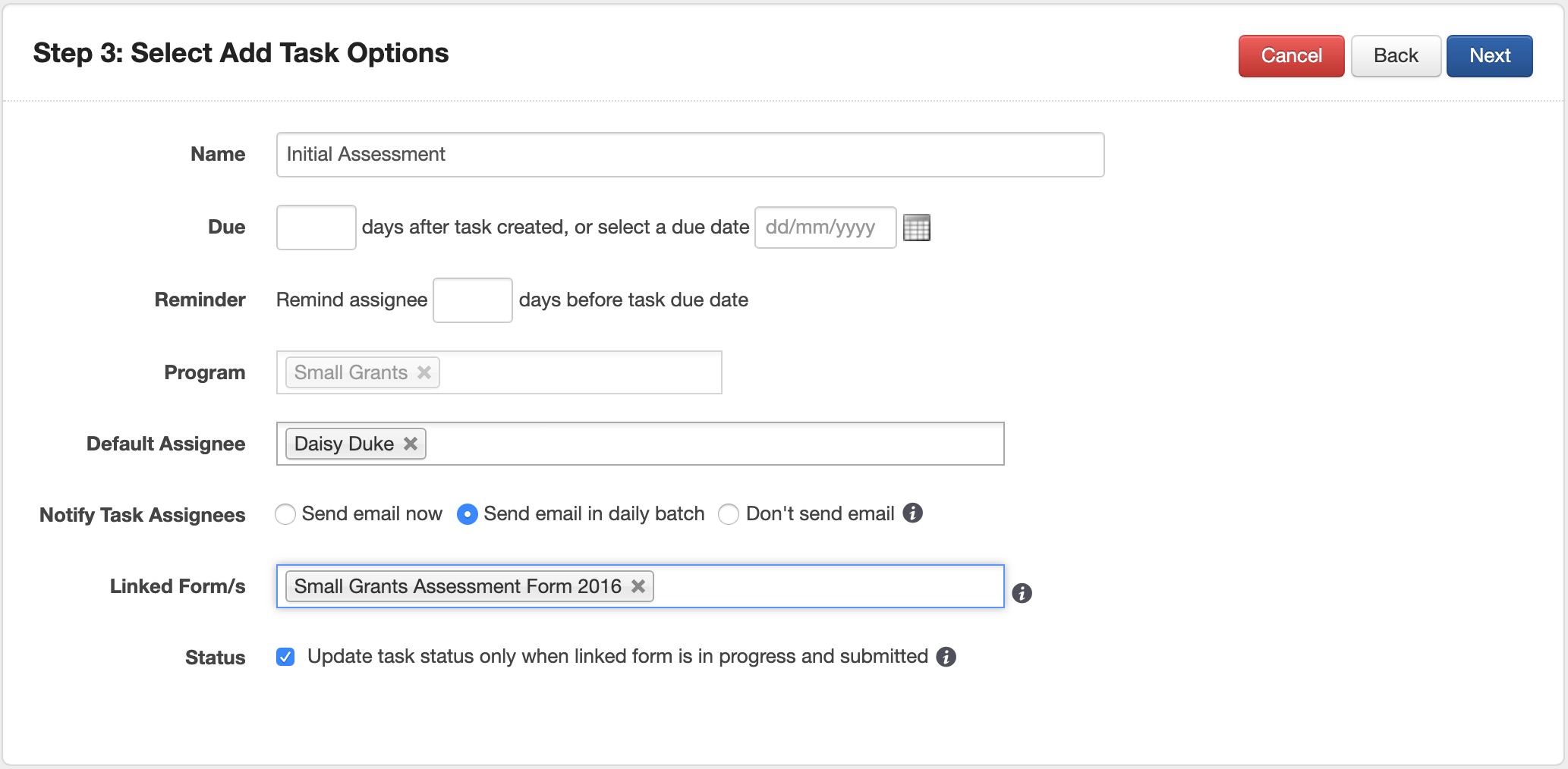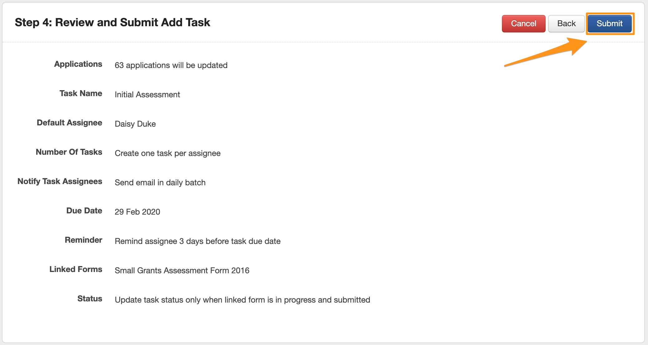 Type the task name, default assignee (if applicable), due date, reminder and linked form (if applicable) of the task to be assigned to all selected applications. You will also be able to define the notification time. Selecting 'Send email now' will batch notifications in 10 minute intervals while the daily batch is sent every morning at 5am. You also have the option to not send a system generated email by selecting 'Don't send email'. Once done, please click on the 'Next' button.