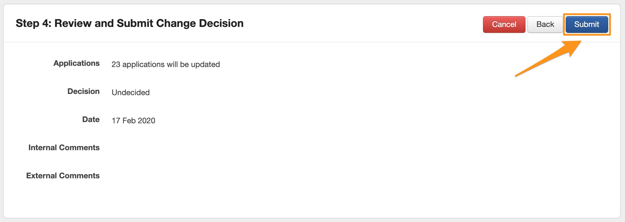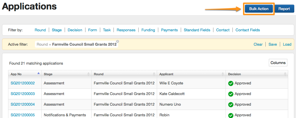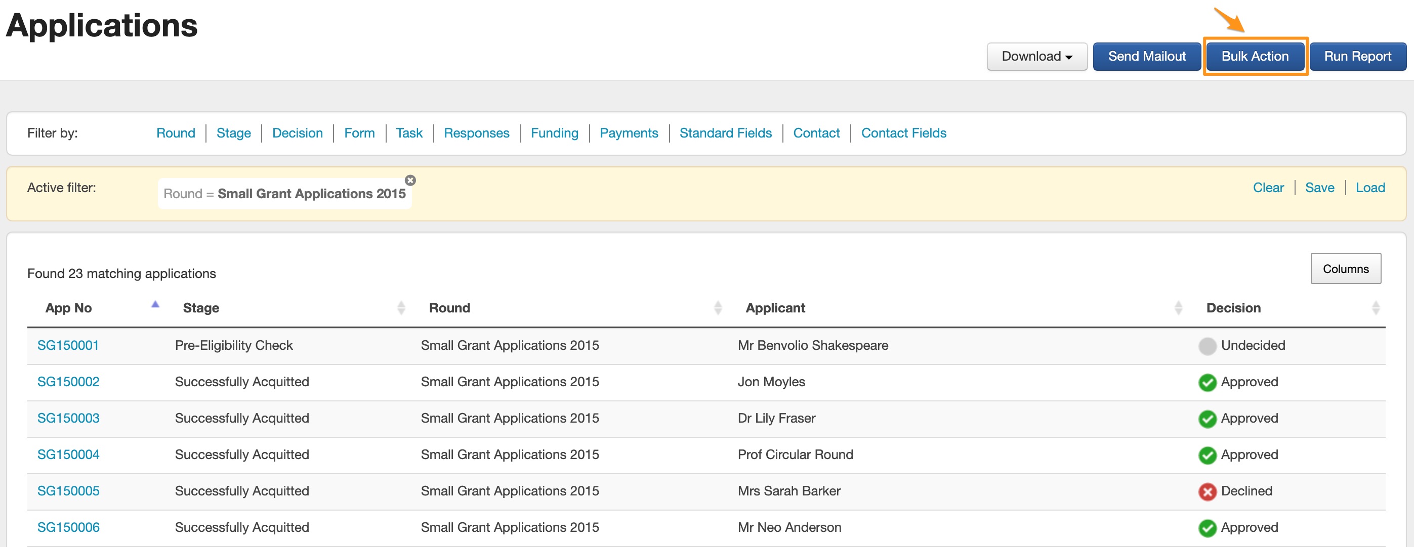 To apply your bulk update go to the Applications filter screen. Apply the filters necessary to obtain the list of applications you wish to change the decision to. Then click on the Bulk Action button in the top right hand side of screen.