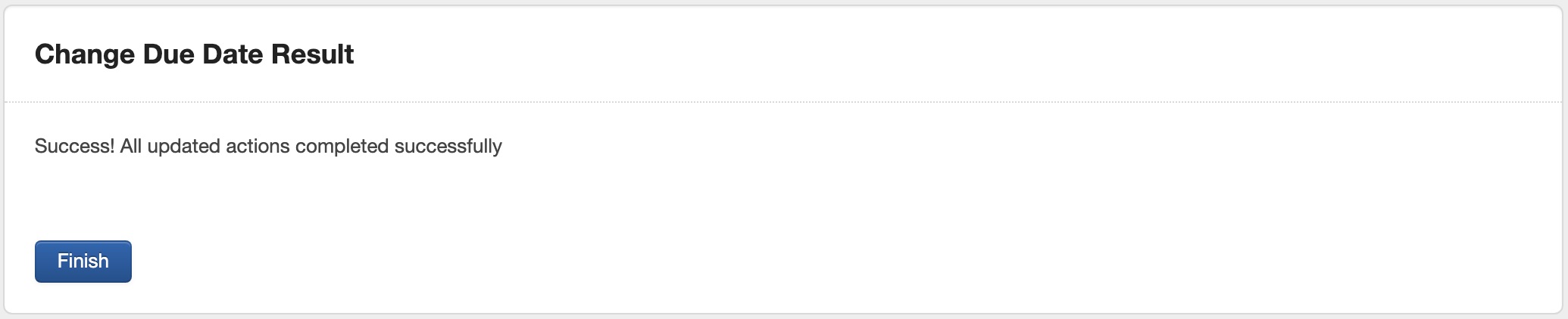 Your Change Due Date action will run and confirm the update has run successfully. Click on the Finish button to return to the Application Filter screen.