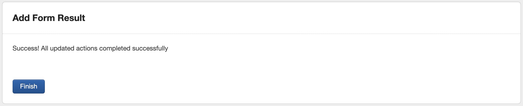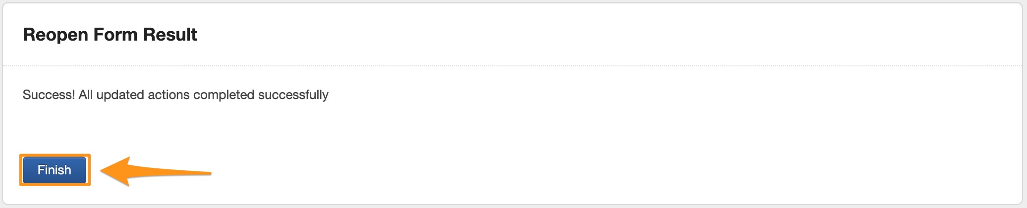 Your Reopen Form action will run and confirm the update has run successfully. Click on the Finish button to return to the Application Filter screen.