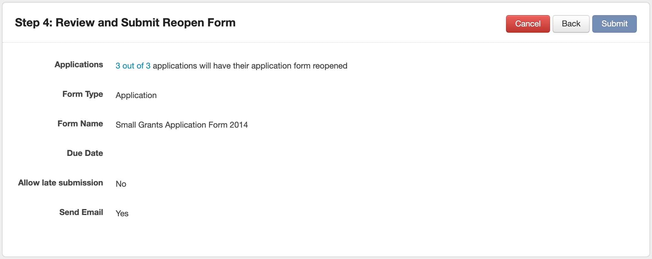 Note: Make sure your applications have the relevant forms on them that you want to reopen. Apply a filter first from the application filter screen, to ensure that the selected applications have a submitted type of form that you want to reopen. eg: If I apply a filter for submitted Acquittal forms, I then have the application set, with acquittal forms on them that I want to reopen in bulk.