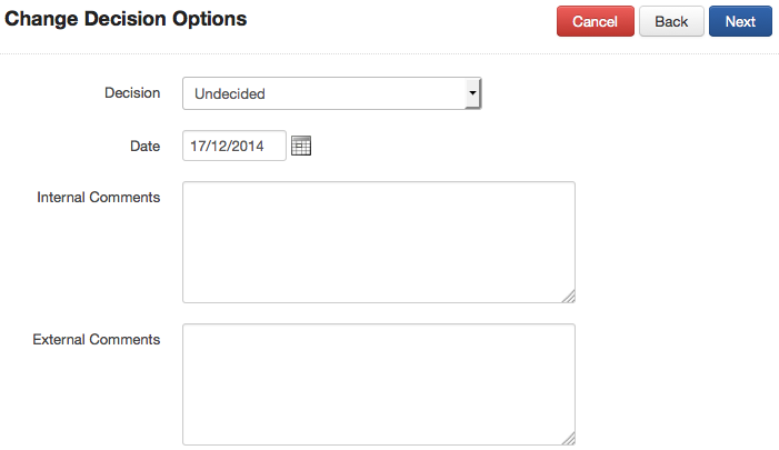 Select the relevant decision, decision date and any internal or external comments you wish to record against all of the selected applications and then click on the 'Next' button.