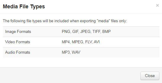 Media files can be exported with attachments, and use the standard export file structure, or alternatively, media files can be exported on their own into a single, flat, zip file.