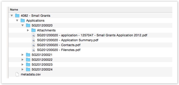 The export zip file follows a standard folder and file structure, whereby each application included in the export is placed within its own folder. All attachments to a form or to a file note for that application are placed within an attachments folder for that application.