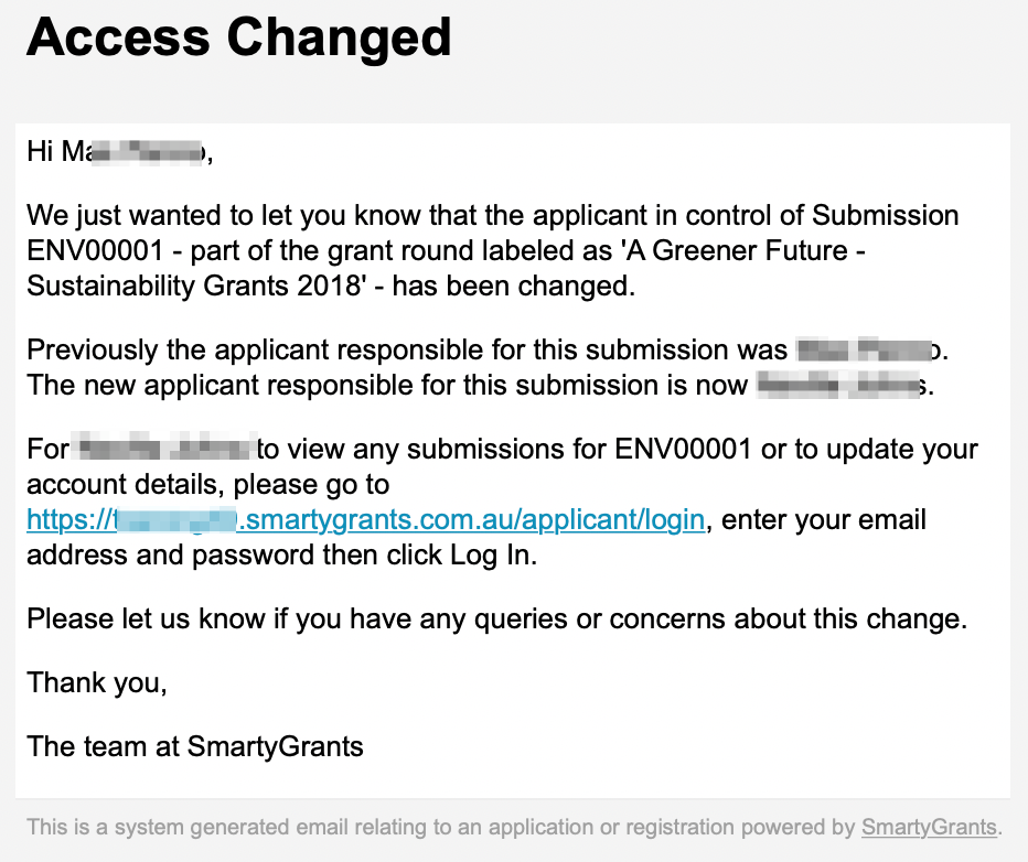 - Once you change the user of an application, both the original applicant and the new user will be sent an email from SmartyGrants advising them of this change. They will recieve an email similar to the one below.