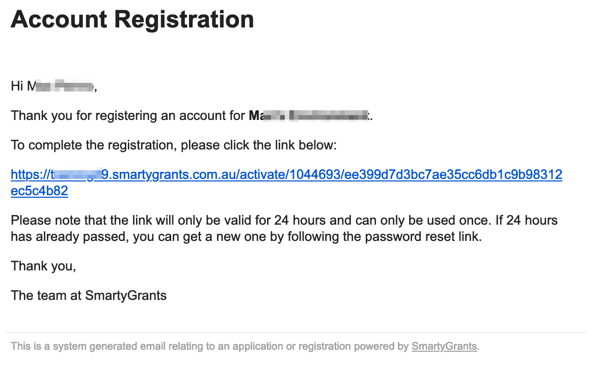 - If the new user does not have a pre-existing account with SmartyGrants, they will receive the following information about how to set up their account and password.