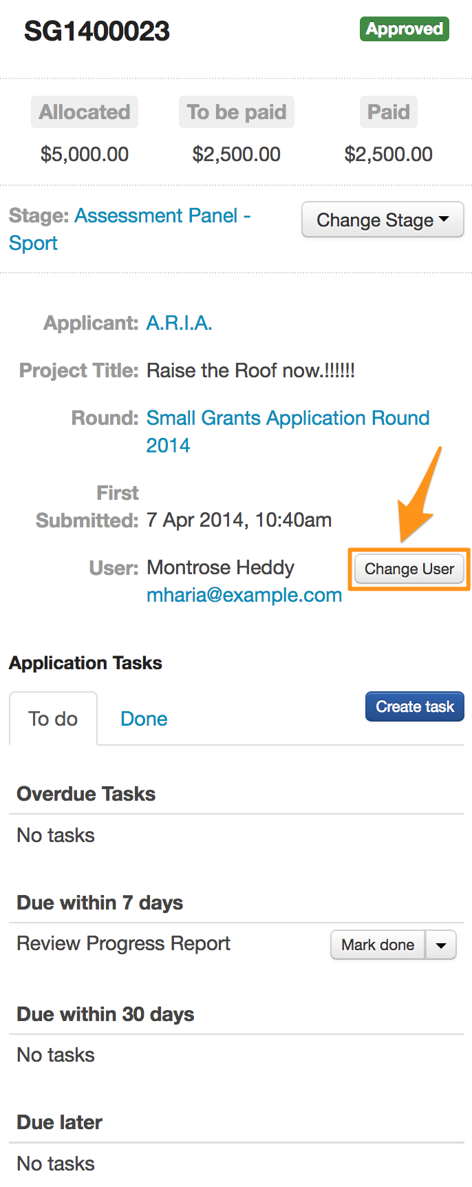 Manage users have the ability to change the user of an application. This can be quite common, for example, the original user who submitted the application then leaves an organisation and needs to give another staff member access to the application or the original user who submitted is not the person responsible for managing the acquittals and now needs access. The application 'user' is the owner of the application login and any e-mail notifications sent from SmartyGrants is sent to this 'user' e-mail address.