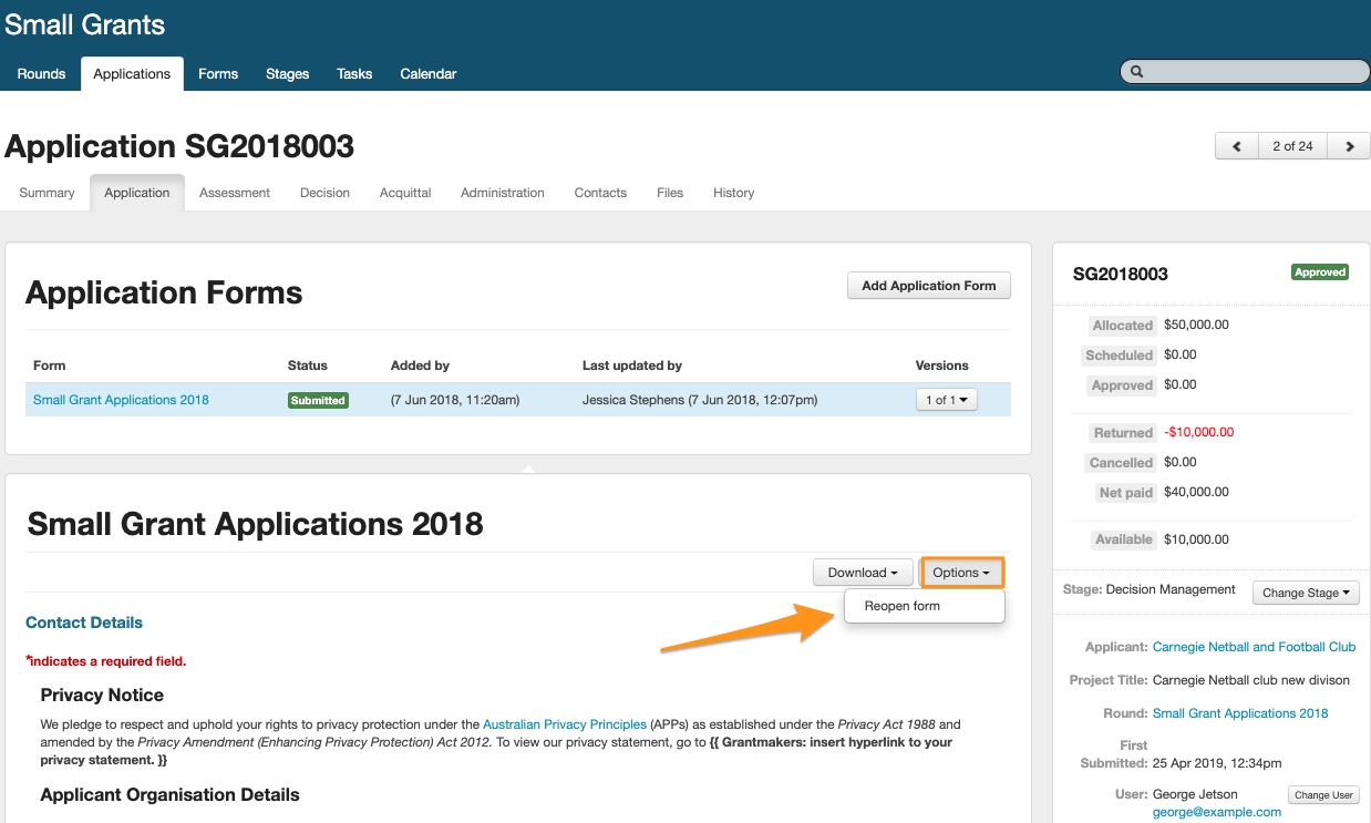If an applicant or assessor, for example, needs to amend the contents of a form they have submitted, you can easily reopen the form for them. When the form is reopened the user will be able to amend the contents of the form and resubmit it to you. Note that an assessor or internal user can also reopen their own forms.