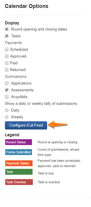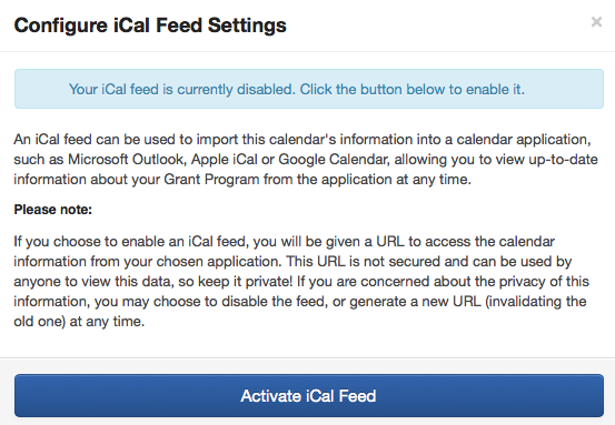 The availability of the iCal / Outlook calendar feed is set for your entire organisation. If you cannot see the Configure iCal Feed button you should contact your account administrators or contact the SmartyGrants Support Team.