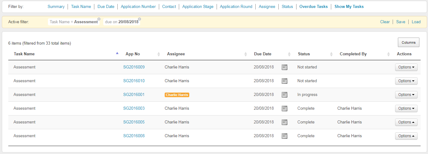 All coloured boxes that appear with items are links. You can click on any of these and the system will take you to the appropriate area and filter to what you had clicked on. For example: If I click on the Green Task - Assessment (6) box on the 20th August, I will be taken directly to the task list tab, where I can view the 6 assessment tasks and the applications they are against.