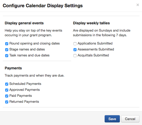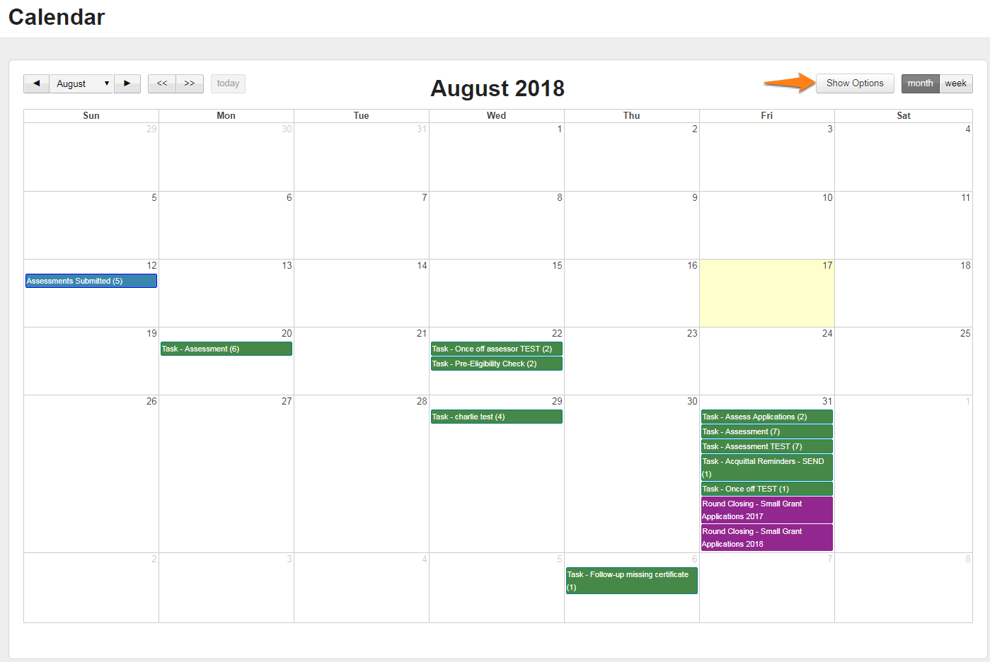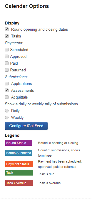 Any start/end or submitted dates of rounds, stage dates, stage and application tasks as well as giving you a weekly tally of application, assessment and acquittal forms are available to appear in the calendar area. You can choose which of these you want to be displayed.