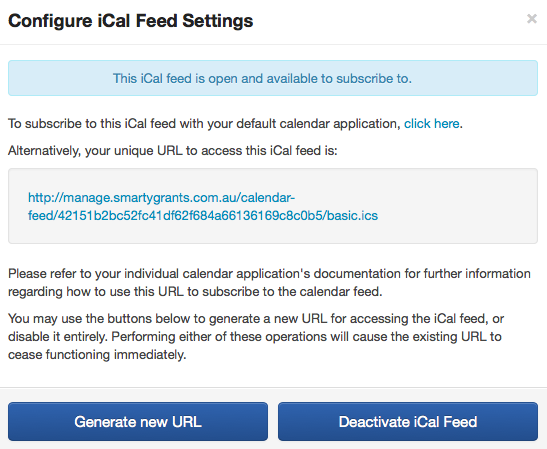 Note: this is a one way 'read-only' feed from SmartyGrants to your e-mail calendar. You cannot make changes to events in Outlook or iCal.