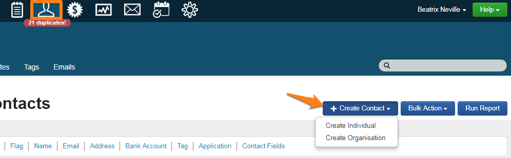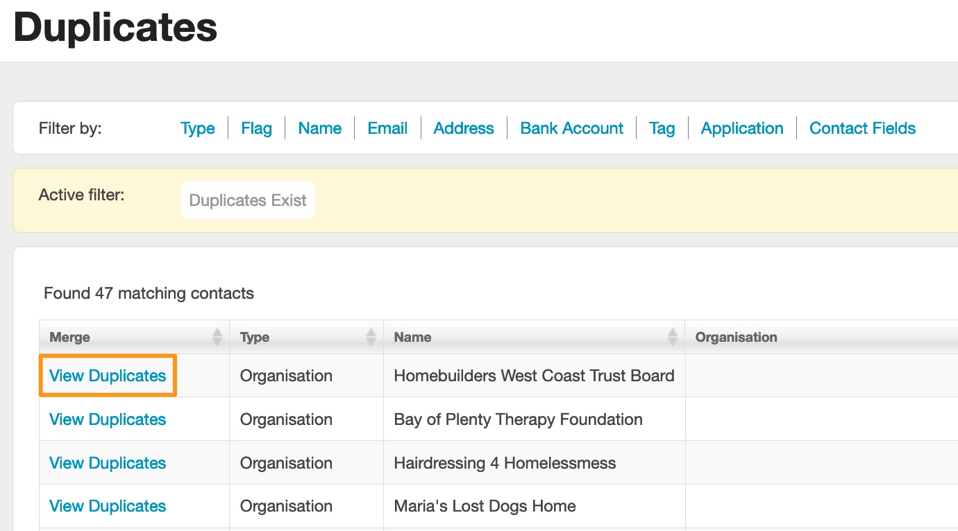 SmartyGrants' Duplicate Finder tool thoroughly scans your Contacts directory for what are potentially duplicate entries - for example, two separate Organisation records with the same ABN that are likely to be the same organisation. Or, two Contact Person entries with the same email address that are likely to be the same person.