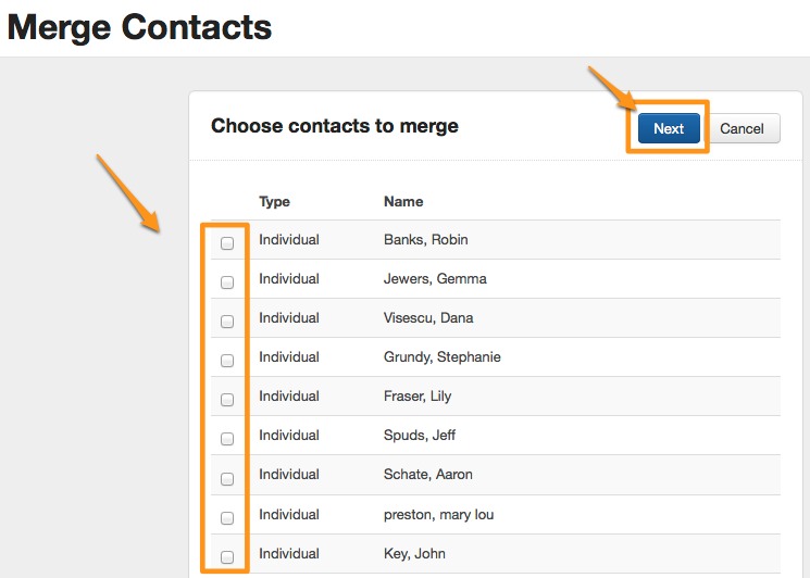 Select the duplicate contacts you wish to bulk merge and click on 'Next'