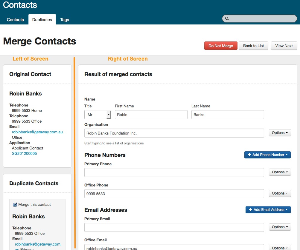 If you decide that the records do need to be merged, the contact details displayed to the right of screen will be saved into the new merged Contact record. You can amend the details on the right of screen, for example, deciding which should be the primary details (click on the options button to amend).