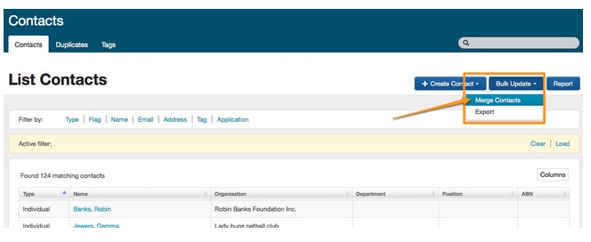 To complete a bulk merge, visit the contact directory and click on the 'Bulk Update' button and select 'Merge Contacts'.