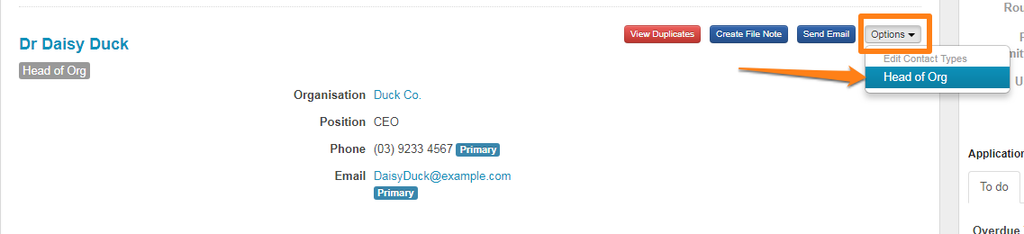 When you merge a contact, you are merging the grant involvement history. This means that in my example above, I need to click into Daisy Duck's contact card, and establish which applications actually belong to the merged contact - Daisy Duke.