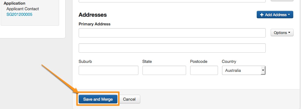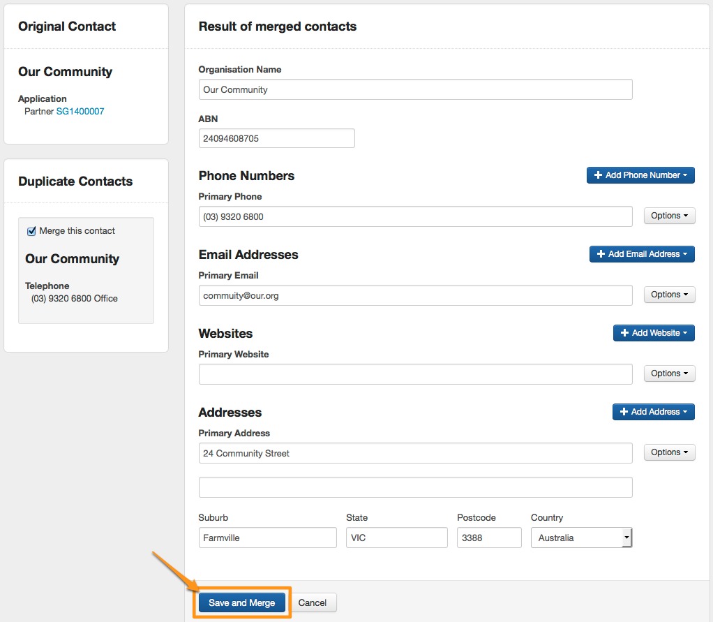 Make any amendments to the details for the merged record and click on 'Save and Merge'.