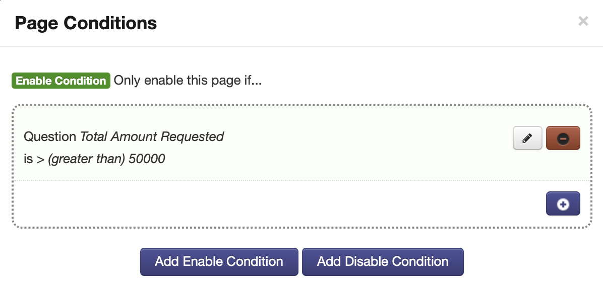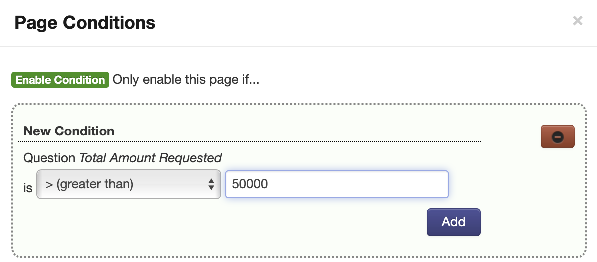 In this example we have selected > (greater than) and set the value at 50,000. Any responses to the Total Amount Requested field over 50,000 (e.g 50,001 or 50,000.10 if using 2 decimal points) will enable or disable the section or page, depending on the type of condition applied.