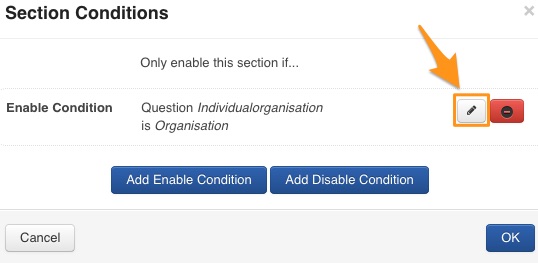 You can edit the conditional logic by selecting the relevant section or page and selecting edit conditions from the control panel (on the left of the screen). You can then select the pencil to edit the condition option.