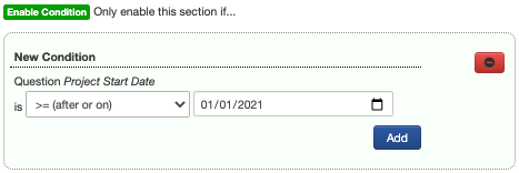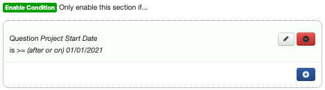 In this example we have selected > (after or on) and set the date at 01/01/2021. Any responses to the Project Start Date field after or on 01/01/2021 (e.g 03/01/2021 or 25/06/21) will enable or disable the section or page, depending on the type of condition applied.
