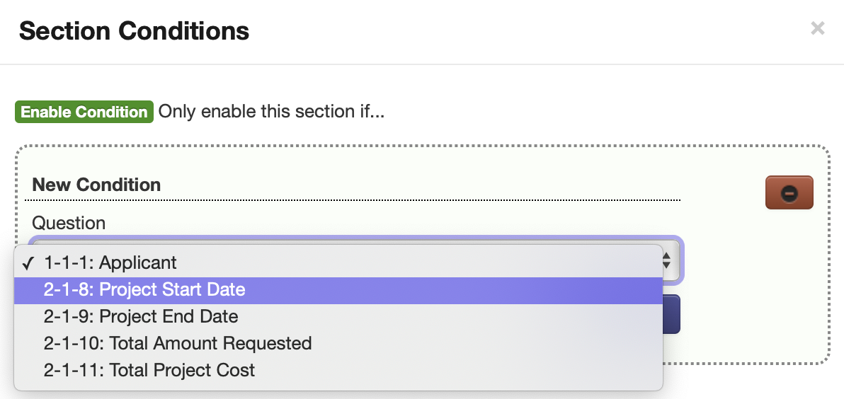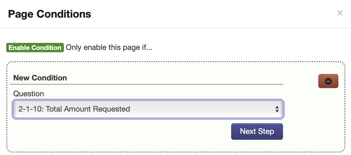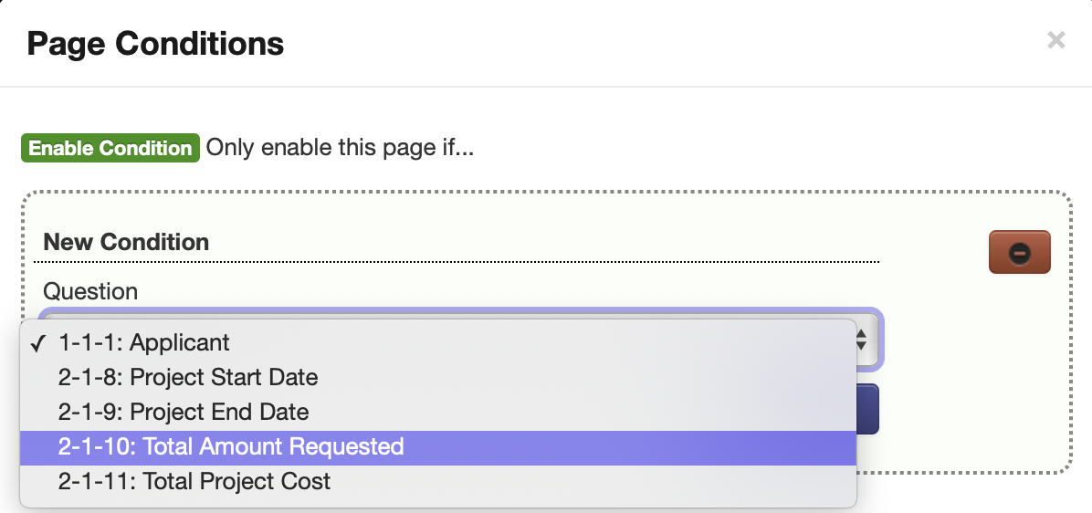 4. Select the Question you wish to base the conditional logic on. In this example we have selected Page 2 Section 1 Question 10: Total Amount Requested (2-1-10)