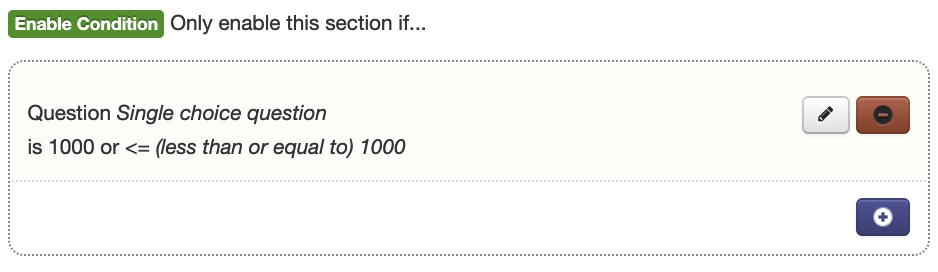 In this example we have selected the choice '1000' and <=(less than or equal to) and set the value/amount at 1000. Any responses to the A Choice Question field, either selecting '10', '100' or '1000' will enable or disable the section or page, depending on the type of condition applied.