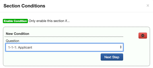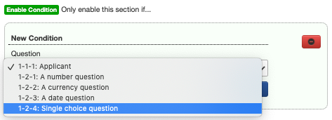 4. A set of compatible choice questions will appear in a drop down box (If nothing appears here, there have been no choice questions created previous to the section/page you are trying to apply the condition for). Select the Question you wish to base the conditional logic on. In the example below we have chosen the Page 1, Section 1, Question 1 (which is displayed as "1-1-1Applicant").