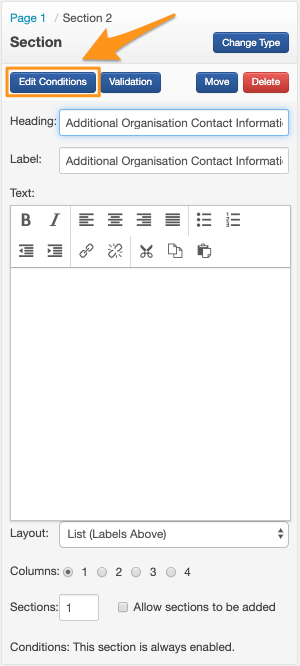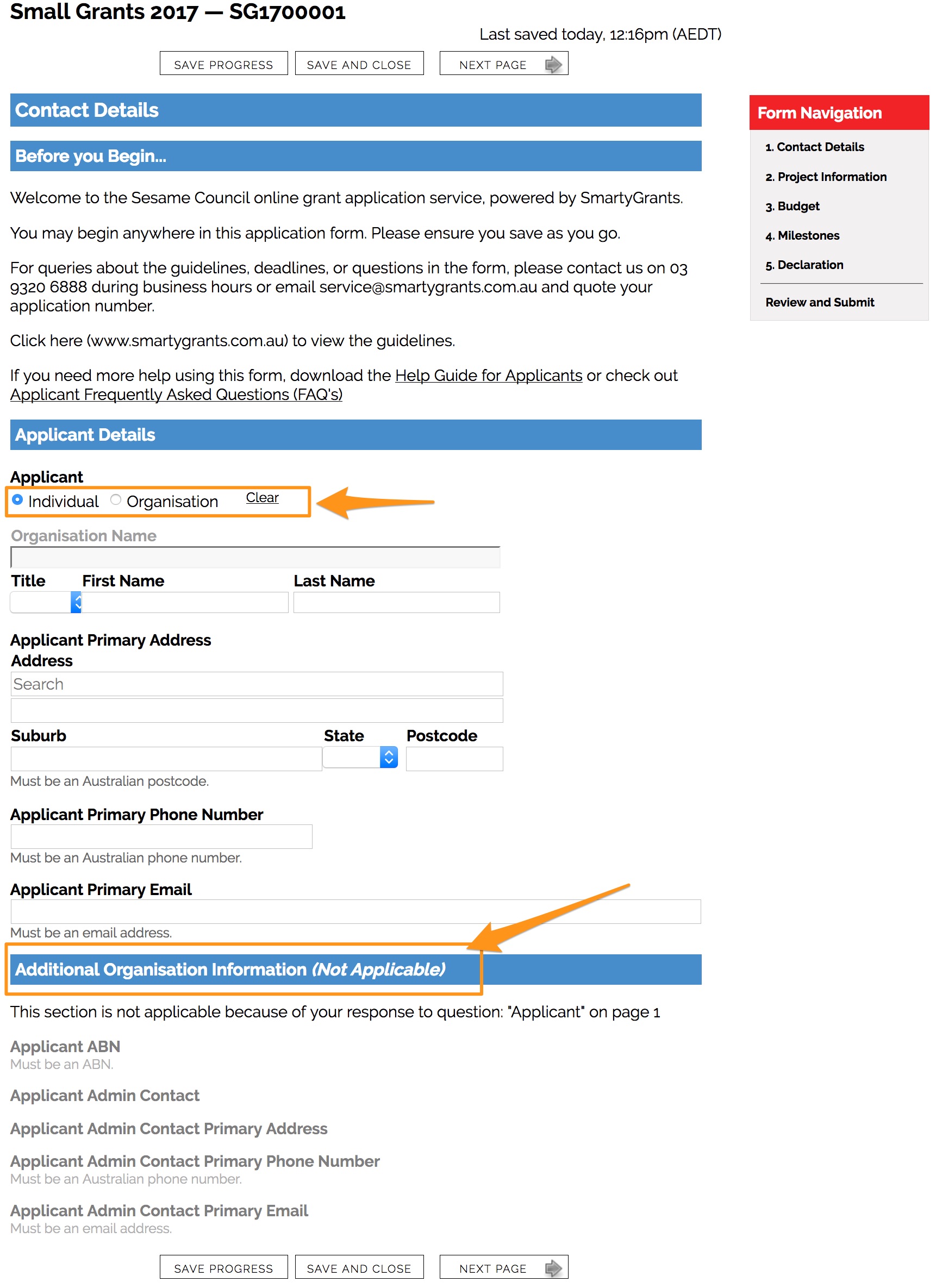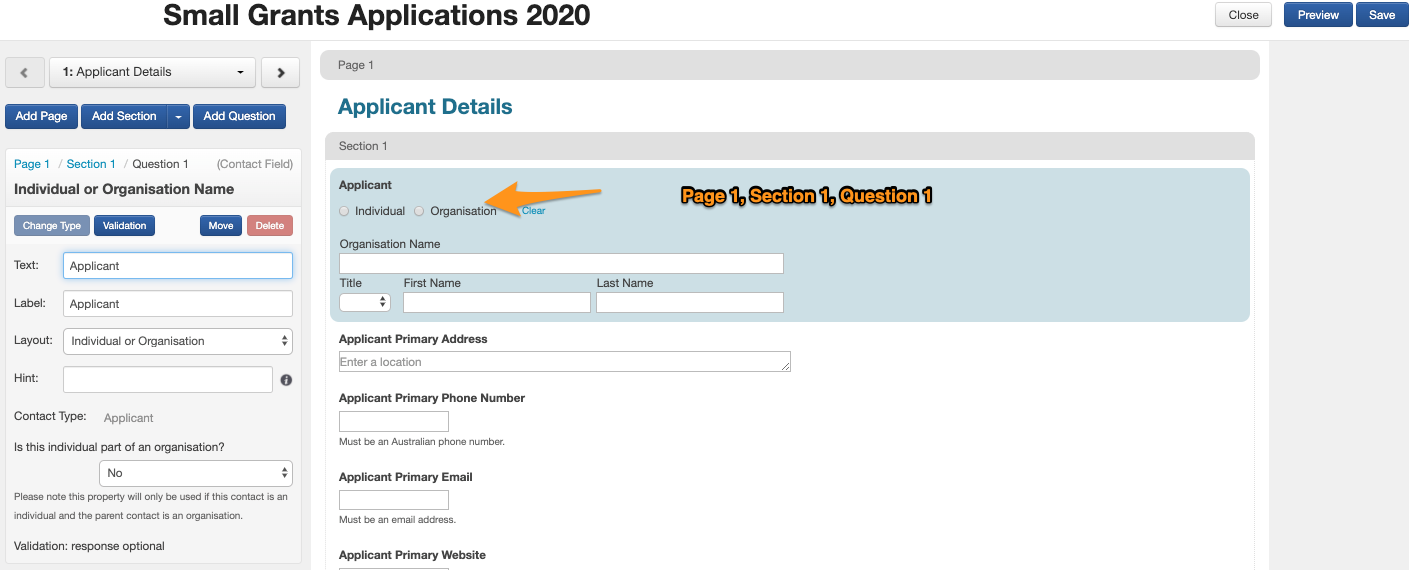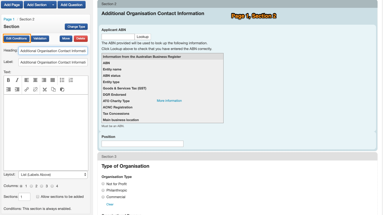 In the example below, we have used the question relating to an Applicant - they need to select whether they are an individual or an organisation (Page 1, Section 1, Question 1). Dependent on their answer, we then want to enable a specific section of the form for them to complete (for example, Page 1, Section 2).